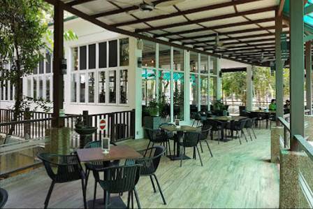 Restoran ini menawarkan tempat duduk luaran yang selesa untuk pengunjung memilih makanan mereka dengan pemandangan yang cantik.